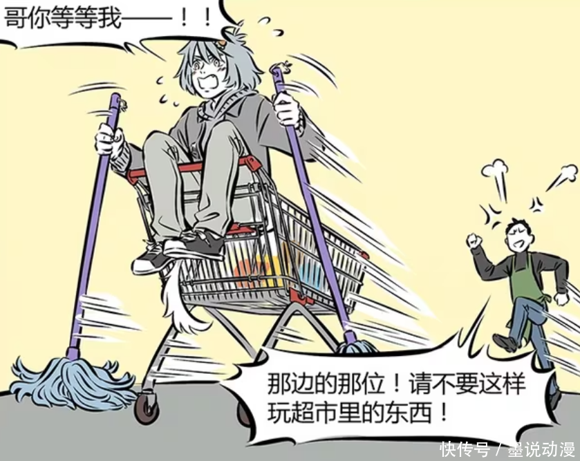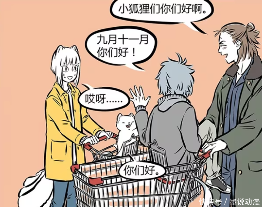 《非东说念主哉》漫画版中,九月偶尔会带着十一月逛超市,不外此时十一月是酿成九尾狐样式,还坐在购物车上。九月怕有东说念主歪曲,然而十一月合计没什么。杨戬也带着哮天来超市购物,不外哮天那么大的东说念主,还坐购物车,后果就被卡在上头下不来。