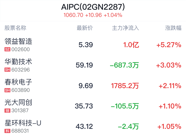 从资金上来看,截止发稿,AIPC倡导主力净流入为3381.98万,其中领益智造受到资金热捧,主力净流入1.02亿;拉万古分线来看,该板块近20日主力资金净流入-13.15亿。