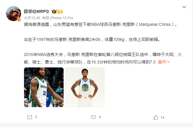 就在今天,东方体育日报记者薛念念佳涌现了一个重磅音书:山东男篮特等签下前NBA球员马奎斯-克里斯。马奎斯-克里斯,27岁,身高2米06,体重109kg,场上级职前卫。2016年NBA选秀大会上,他在首轮第八顺位被国王队选中,之后在太阳、火箭、骑士、骁雄、独行侠等多支NBA球队遵守。在NBA的作事生活中,他场均出场18.3分钟,孝敬7.5分和4.7个篮板,投篮射中率达到45.6%,三分射中率为29%。