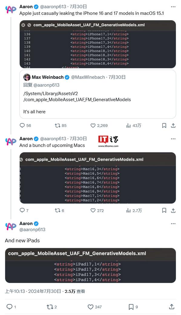 IT之家 7 月 31 日音尘,音尘源 @aaronp613 今天在 X 平台发布推文,在 macOS 15.1 Sequoia Beta 测试版代码中,发现了诸多尚未发布的新品,涵盖 iPhone、Mac 和 iPad。