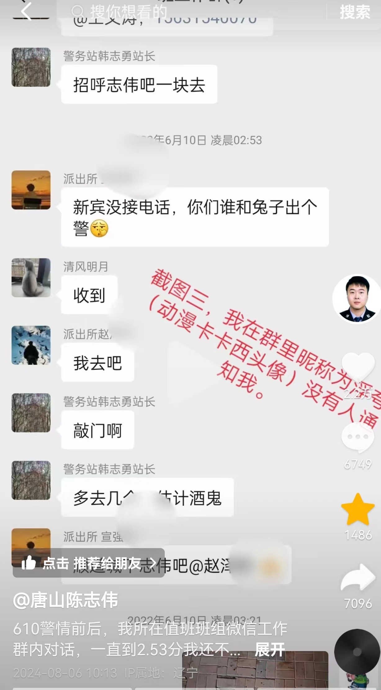 陈志伟公布了几张微信值班群的截图称,在“6·10”警情(唐山烧烤店打东说念主事件)前后,我方直到凌晨2时53分王人不知说念该警情,也没东说念主号令其临时出该警。陈志伟默示这些截图不错评释我方不是主要认真该起警情的民警。