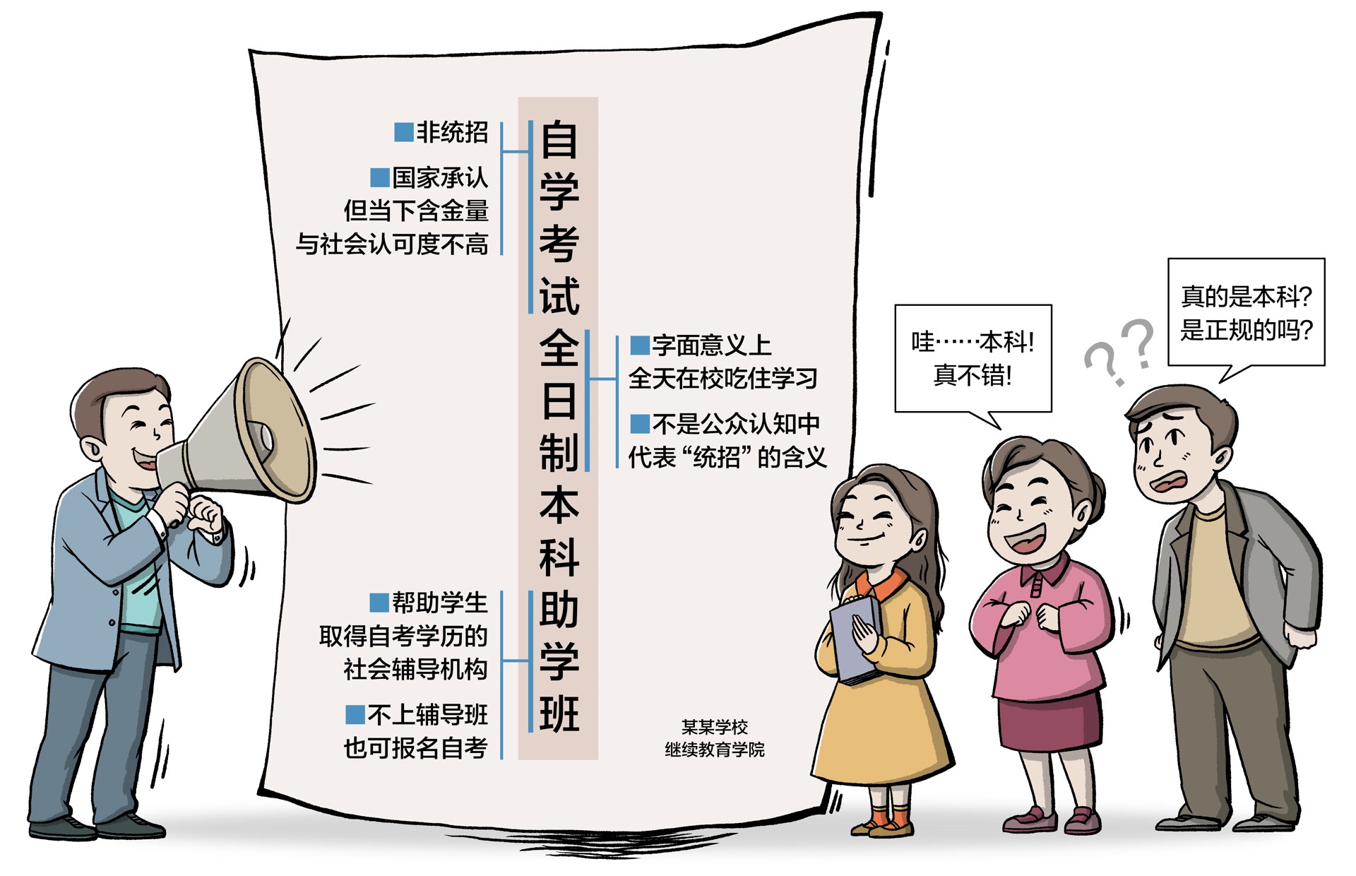 在通晓了解上述内容的前提下,学生若仍容或破耗数万元选拔全日制自考助学班,全天候“体验”大学生涯,那无非是一种个东谈主选拔。但对一些只达到专科线以致莫得学校可去的学生来说,本就处于黯淡和惊恐之中,招生东谈主员刻意概括自考与统招的区别,忽悠学生花高价去读个“假大学”,才是问题的压根。