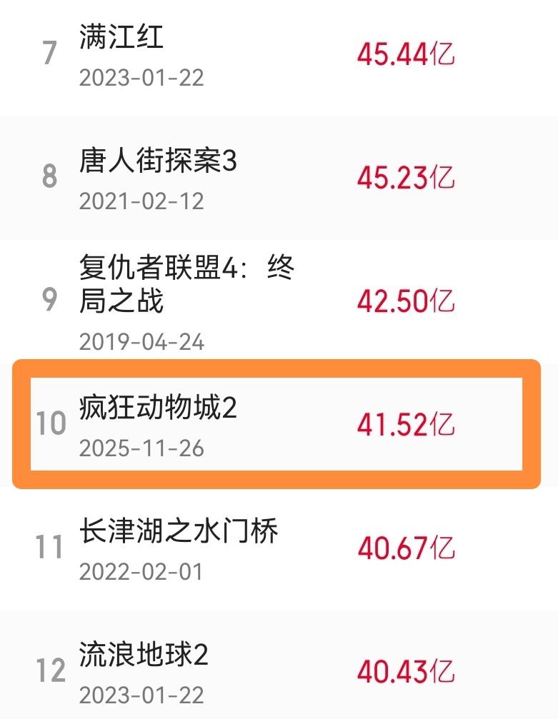 然而今日最猛的照旧《狂妄动物城2》,记者今日晚上在合肥一家影院看到(记者去看的是六点钟的《过家家》),最新上映的元旦档新片中,主打悬疑的《匿杀》和粉丝向的《寻秦记》有着可以的排片,嗅觉主力不雅影东谈主群是情侣档和姐妹花档。而带着孩子的,基本王人是来看《狂妄动物城2》的,是以就发生了目下的这个情况,在公映的第37天,这部动画片单日再次票房破亿。若何说呢,在中国影史票房榜单上,通顺翻越《流浪地球2》(40.43亿元)和《长津湖之水门桥》(40.67亿元),成为榜单第十。排在前边的《复仇者定约4:终端之战》(42.5亿元),行将迎来跌落到第十位的终端运谈。盖瑞有蛇年加合手,可能日期翻到公元2026年,还没到农历马年,是以《狂妄动物城2》的票房还能再飞一会。