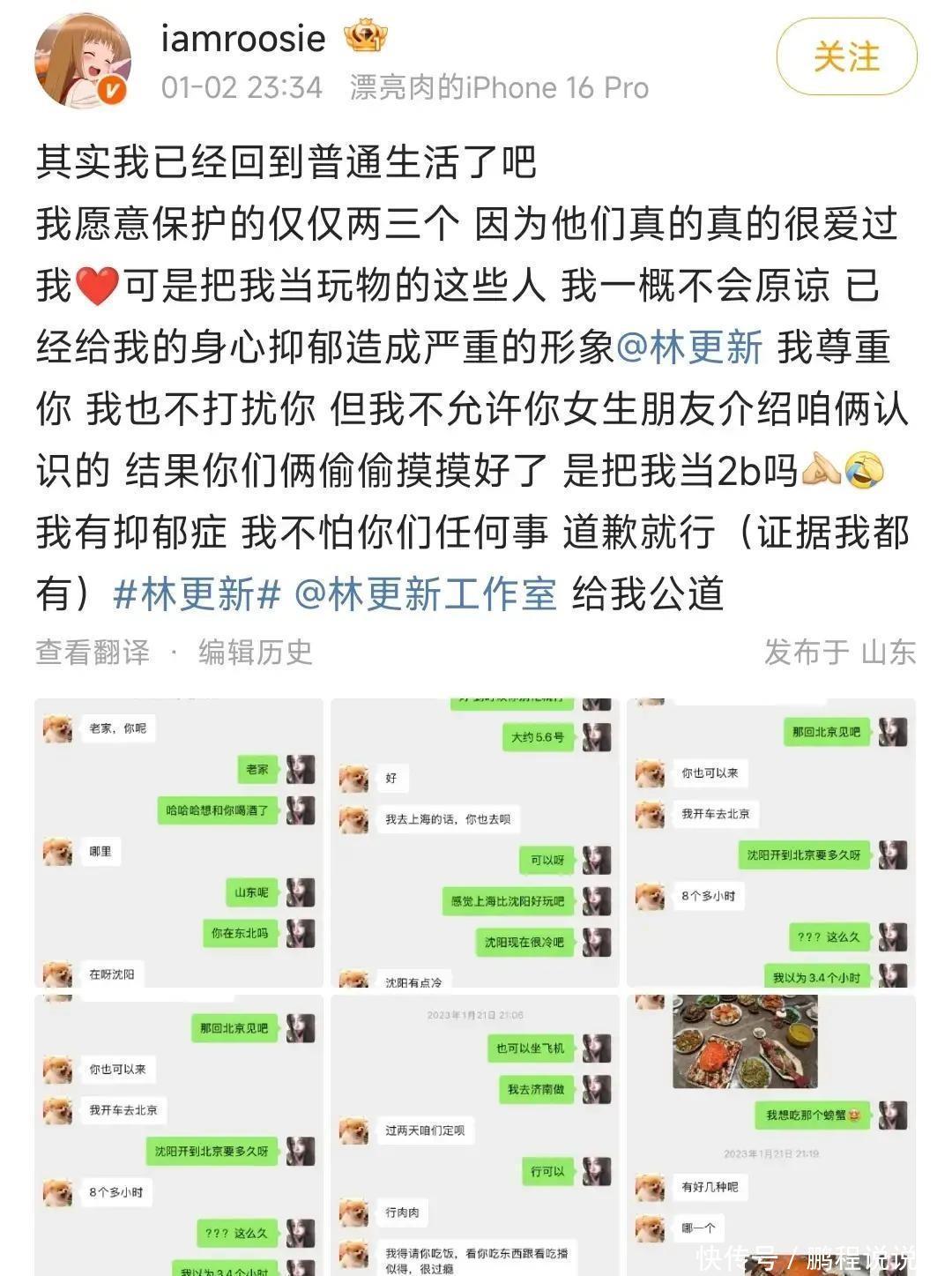 另一位被点名的明星是林更新,司晓迪暗示林更新曾邀请我方去东北,自后因为林更新的一些动作让我方抑郁,何况屡次提到两东谈主擅自的互动,司晓迪爆出来的聊天记载莫得什么尽头的内容,只可看出两东谈主之间像世俗一又友雷同聊天,莫得任何本色性的笔据。网友们对此暗示质疑,她是不是在用“抑郁症”博取世界的爱怜。
