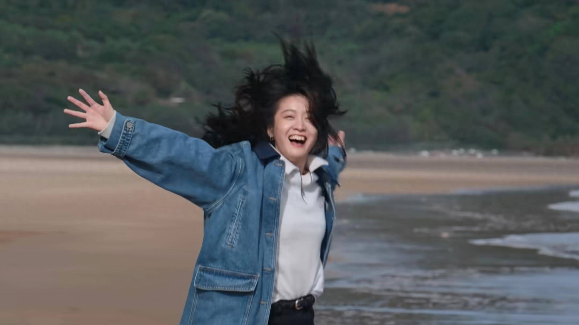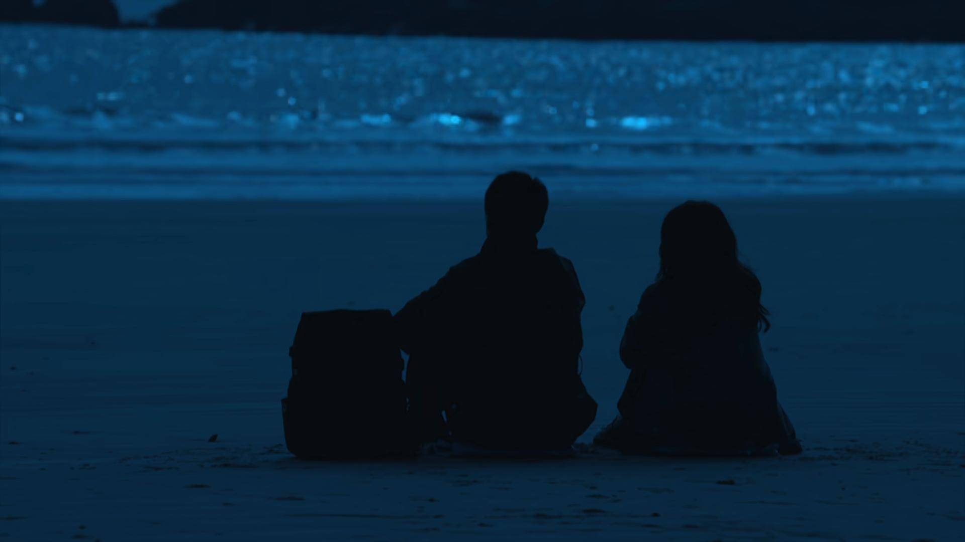 “横漂”失败的剧组统筹林笠(张雪迎饰)和来堪景的文艺片导演顾远(高至霆饰)在海滩奔走打闹,早晨的阳光洒在海面上,水光潋滟。