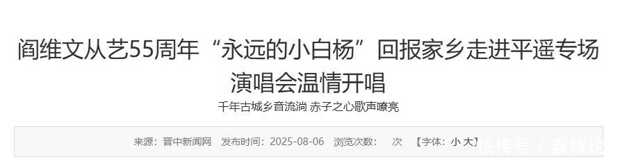 晋中新闻网2025-08-06阎维文从艺55周年“永远的小白杨”报告家乡走进平遥专场演唱会轻柔开唱