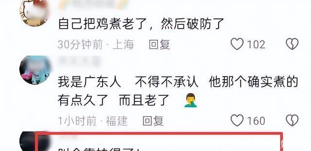 许多网友在驳斥区质疑起了全进华的厨艺。 许多网友默示,全进华诚然用的是好鸡,然而厨艺一般,没以后把鸡煮好。 因此,把锅全甩给原材料的全进华被节目淘汰亦然理所应当的。