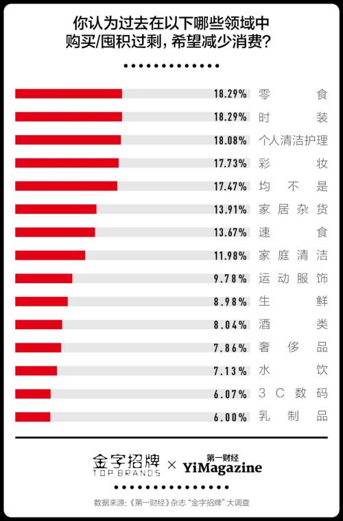 本年在咱们的调研中,不涨薪的东谈主群占比为48.29%,较上年高涨5.08%,降薪的东谈主群占比为9.57%,同比增多1.55%,还有2.11%的东谈主本年被裁人,比客岁增多0.65%。复杂的环境中,越来越多品牌开动持重降本增效,个东谈主其实亦然如斯。当东谈主们重新整理我方的活命,就会发现历程了几年大促的轮替刺激,许多破钞品其实囤积过多。零食、时装、彩妆、个护是咱们调研中破钞者以为囤积过多需减少破钞的前四个大项。
