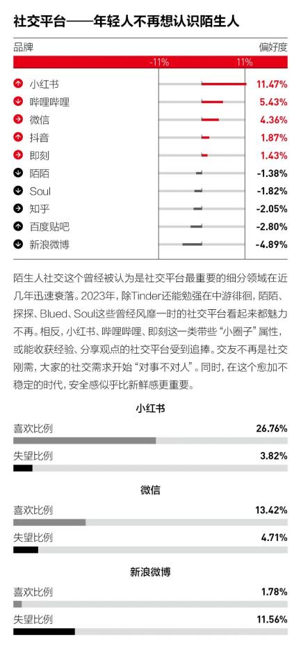 要雄伟东谈主们破钞心态的震动,不妨去看一看他们的在线酬酢活命。本年,小红书成为酬酢平台第一,而盘踞榜首多年的微信掉到了第三。2022年春节技能,小红书在文书新代言东谈主的同期将平台定位明确为“你的活命指南”,不再局限于潮水活命与破钞种草,标明了扩大用户半径的品牌诉求。外界的变化让东谈主们厌倦了熟东谈主间的骄气型、岁月静好型酬酢,于是更渴慕找到一个吸收和传递实用信息的平台,于是小红书成为了更相宜东谈主们当下交流需求的酬酢新阵脚。