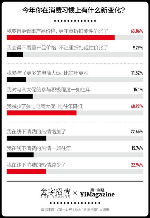 履历这一切后,有37.66%的受访者默示本年我方的购物欲下降了。更有63.06%的东谈主告诉咱们,他们开动比以往更持重性价比。同期,40.92%的东谈主默示本年减少了参与电商大促。