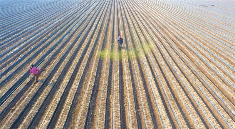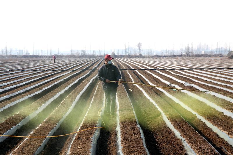 3月5日,农民在山东省聊城市茌平区贾寨镇贾寨后村田间给栽种的丹参喷洒除草药物(无东谈主机像片)。